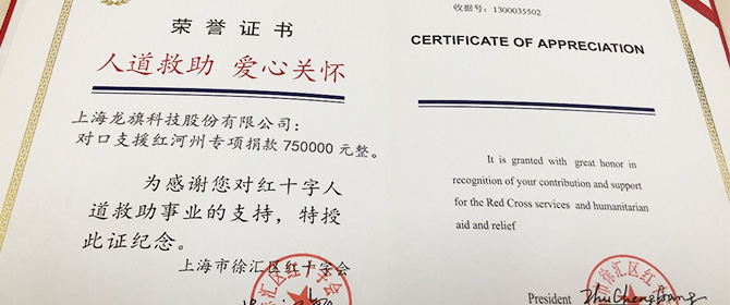 2017年11月,對口支援紅河州龍旗捐款榮譽證書