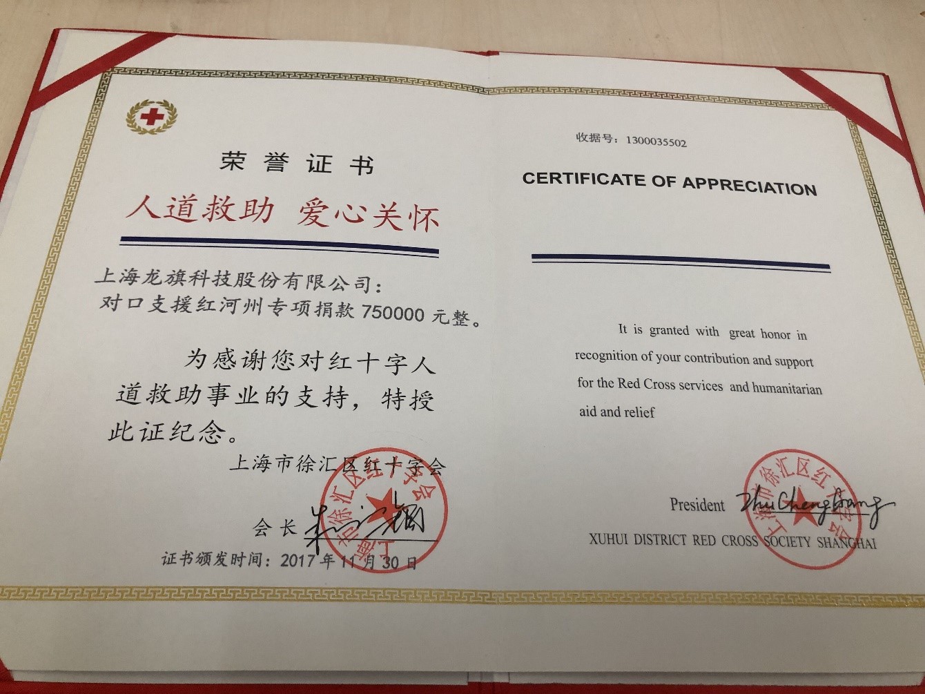 2017年11月,對口支援紅河州龍旗捐款榮譽證書
